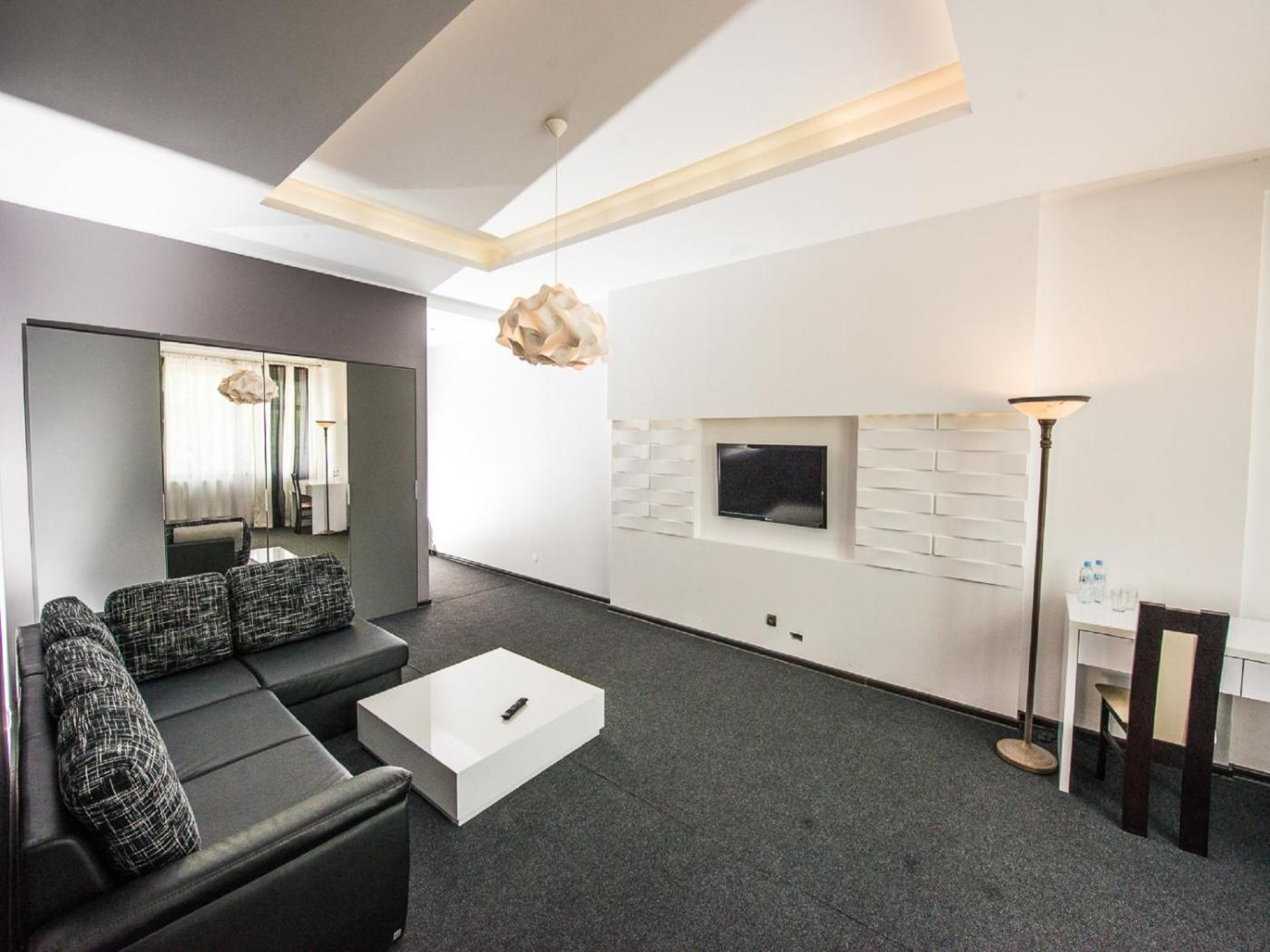 Apartament (2 osoby dorosłe). Jest to przestronny apartament z częścią wypoczynkową. Do pokoju tej kategorii można wstawić dodatkowe łóżko (rozkładaną sofę). Goście proszeni są o kontakt z personelem obiektu w celu potwierdzenia tej możliwości. Apartament - 2 osobowy. Powierzchnia pokoju ok.: 35 mkw. ;