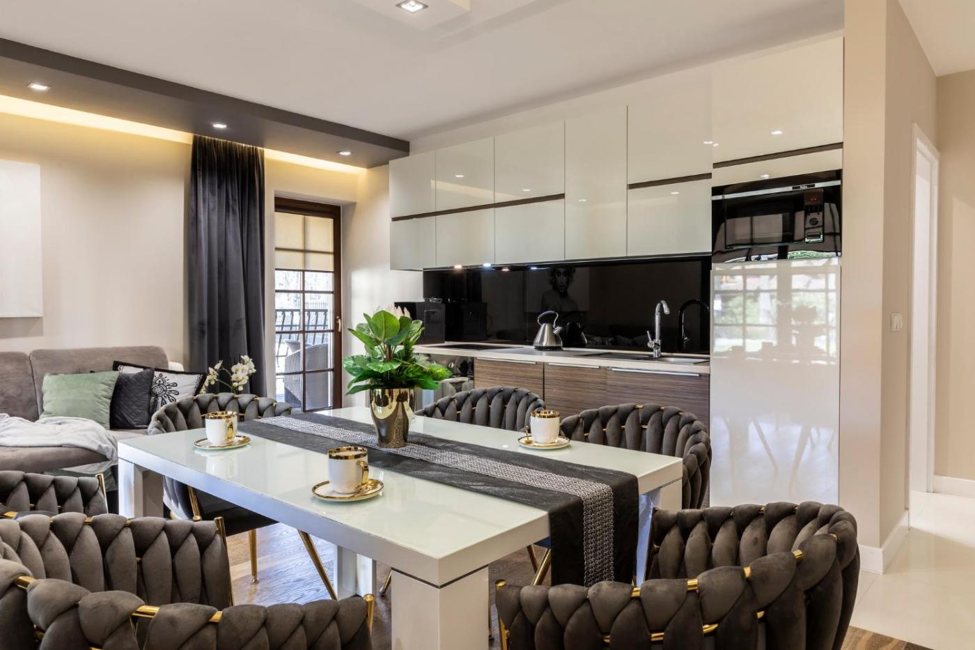 Apartament z 2 sypialniami. This apartment is comprised of 1 living room, 2 separate bedrooms and 1 bathroom with a shower and free toiletries. In the well-equipped kitchenette, guests will find a stovetop, a refrigerator, a dishwasher and kitchenware. Featuring a terrace with garden views, this apartment also offers a washing machine and a flat-screen TV with cable channels. The unit offers 4 beds. Apartament - 6 osobowy. Powierzchnia pokoju ok.: 57 mkw.